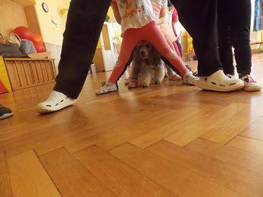 A legkisebbeket mondókákkal, énekekkel és egyszerű mozgásos játékokkal várják a terápiás kutyáink (Andi és Pedro).